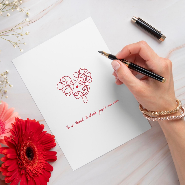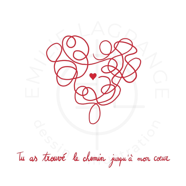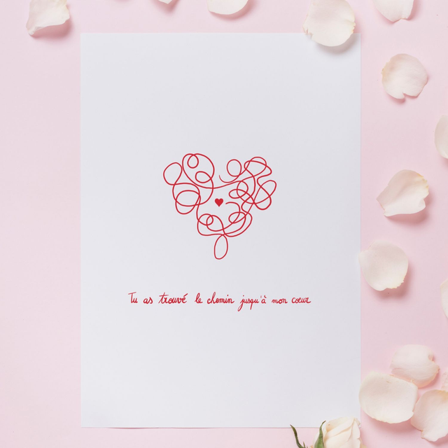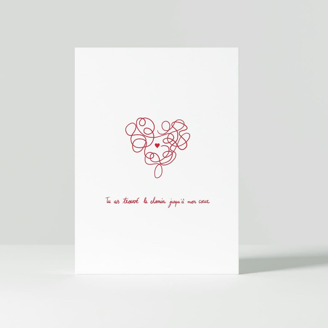 Partagez un petit mot d'amour avec la personne qui vous tient à cœur. Cette carte porte un dessin et des mots simples pour dévoiler la beauté de votre message. Pas de superflu ni d'artifice. Juste un mot de tendresse et d'amour à offrir. Cette carte porte le message "Tu as trouvé le chemin jusqu'à mon cœur". Elle fait partie d'une collection de cartes postales, avec 5 designs et messages uniques. À offrir à votre partenaire de vie, pour la Saint-Valentin ou tout au long de l'année.