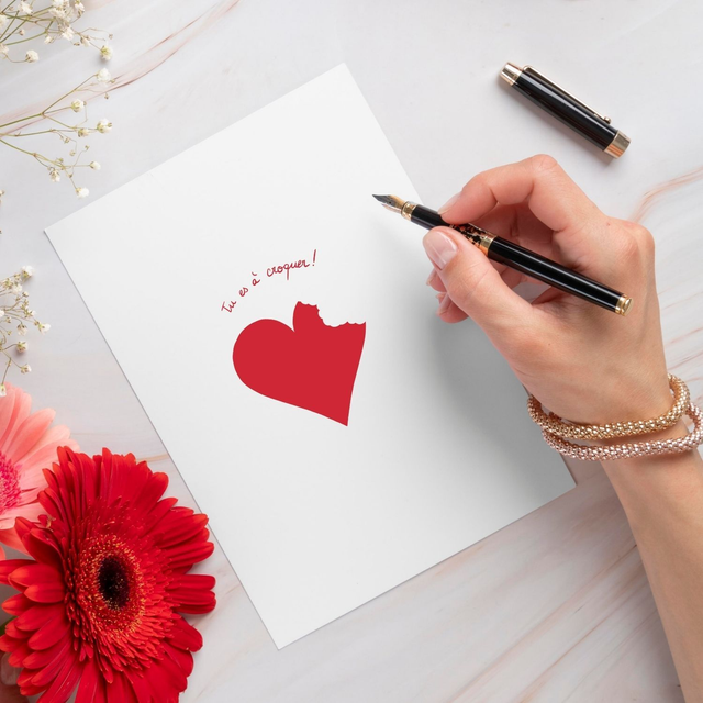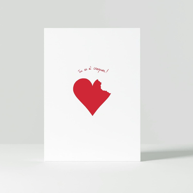 Partagez un petit mot d'amour avec la personne qui vous tient à cœur. Cette carte porte un dessin et des mots simples pour dévoiler la beauté de votre message. Pas de superflu ni d'artifice. Juste un mot de tendresse et d'amour à offrir. Cette carte porte le message "Tu es à croquer !". Elle fait partie d'une collection de cartes postales, avec 5 designs et messages uniques. À offrir à votre partenaire de vie, à un.e ami.e ou à une personne chère à votre cœur. Pour la Saint-Valentin ou tout au long de l'année.